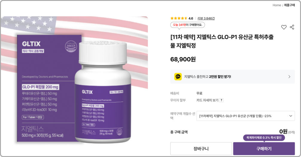 특히 '지엘틱정'이라는 제품이 눈에 띄는데요. 벌써 11차 예약 판매까지 진행될 정도로 인기가 엄청나다고 합니다.